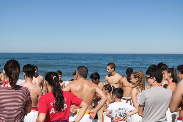 foi assim que após a alvorada no dia seguinte, se juntou à comitiva do Clube parte da restante "família" da Associação Juvenil de Karaté de Portugal, e às 10:00 começou o treino de Karaté na praia, orientado pelo Director Técnico da Associação, Sensei Filipe Ferreira. Este treino é o ponto alto do evento anual, pois permite a todos os atletas desenvolver e demonstrar as suas capacidades num ambiente pouco habitual (praia), ao mesmo tempo que toda a população de veraneantes que frequentam a praia a essa hora é confrontada de repente com um treino de cerca de 45 guerreiros que trocam o tatami pela areia. O treino finaliza, como é hábito, com uma série de incursões nas águas do Atlântico, que este ano estavam surpreendentemente amenas.